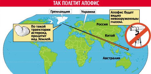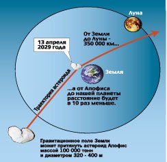 За следующие два года с астероидом случилось немало интересного. Вместо номера у него появилось имя — Апофис. Так древние греки звали египетского Бога Тьмы и Хаоса Апепа. Также ученые уточнили его размеры, массу (около 100 миллионов тонн) и точную траекторию. Последняя оптимизма не вызвала. Оказалось, что 13 апреля 2029 года астероид пройдет между Землей и Луной всего на расстоянии 30 — 40 тысяч километров от нашей планеты. В ночном небе он будет заметен даже без бинокля и телескопа.