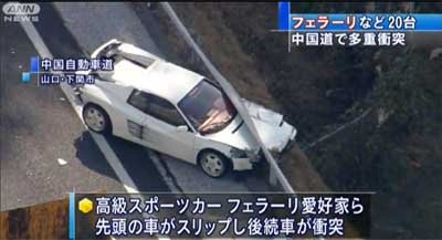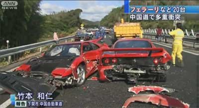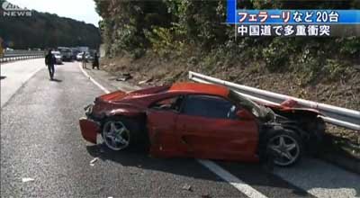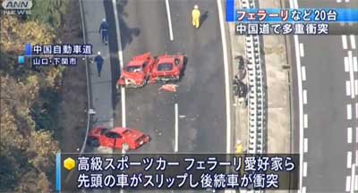 Сразу восемь «Феррари», один «Ламборджини Диабло», три «Мерседеса», а также «Нисан Скайлайн» и «Тойота Приус» столкнулись на трассе между префектурой Хиросима и регионом Кюсю в воскресенье около 10:15 по местному времени.