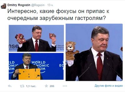 Комментируя выступление украинского президента, вице-премьер России Дмитрий Рогозин сравнил президента Украины Петра Порошенко с гастролирующим артистом.