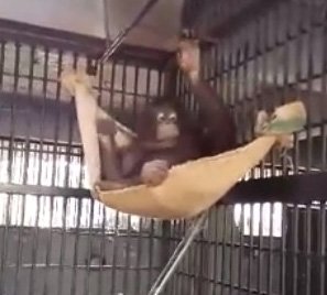 На записи орангутан находится в небольшом вольере с бетонным полом, на котором «не слишком удобно спать». Чтобы устроиться получше, обезьяна берет кусок ткании привязывает его сначала к одной, а затем к другой стенке вольера.
