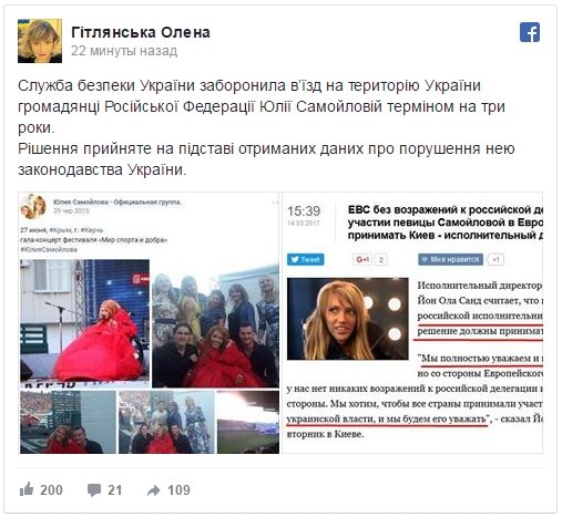 Как заявила пресс-секретарь ведомства Елена Гитлянская в своем Facebook, соответствующее решение было принято на основании данных о нарушении Самойловой законодательства Украины.