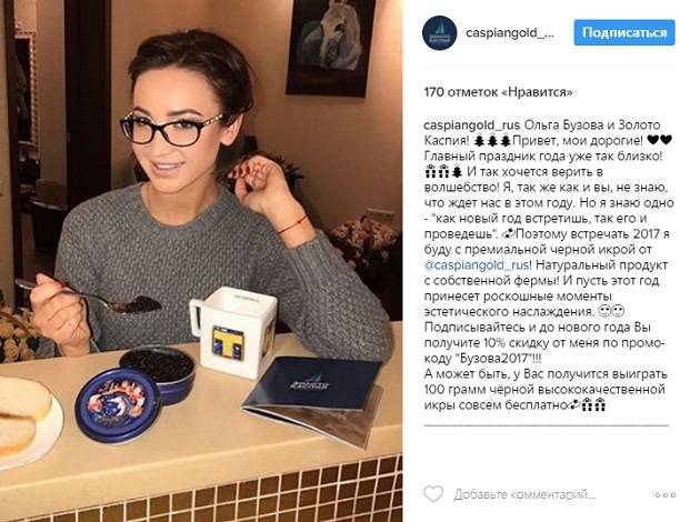 Телезвезда заявляла со страниц Instagram о том, что будет встречать 2017 год именно с этой элитной икрой, которую Бузова назвала "натуральным продуктом с собственной фермы".