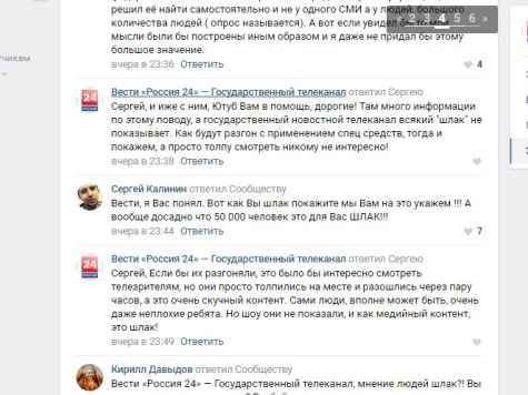 В официальном аккаунте канала "России 24" в соцсети "ВКонтакте" появилось объяснение, почему телевидение проигнорировало прошедшие накануне в Москве массовые акции протеста. По словам сотрудников, вместо "шоу" на улицах был "шлак".
