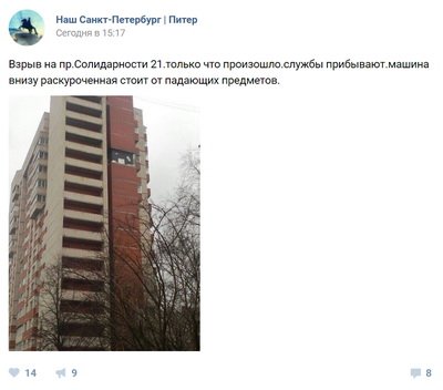 6 апреля в жилом доме на востоке Санкт-Петербурга произошёл мощный хлопок, сообщает "Интерфакс". Как уточняет ТК "Звезда", взрыв произошел в 16-этажном доме на проспекте Солидарности.