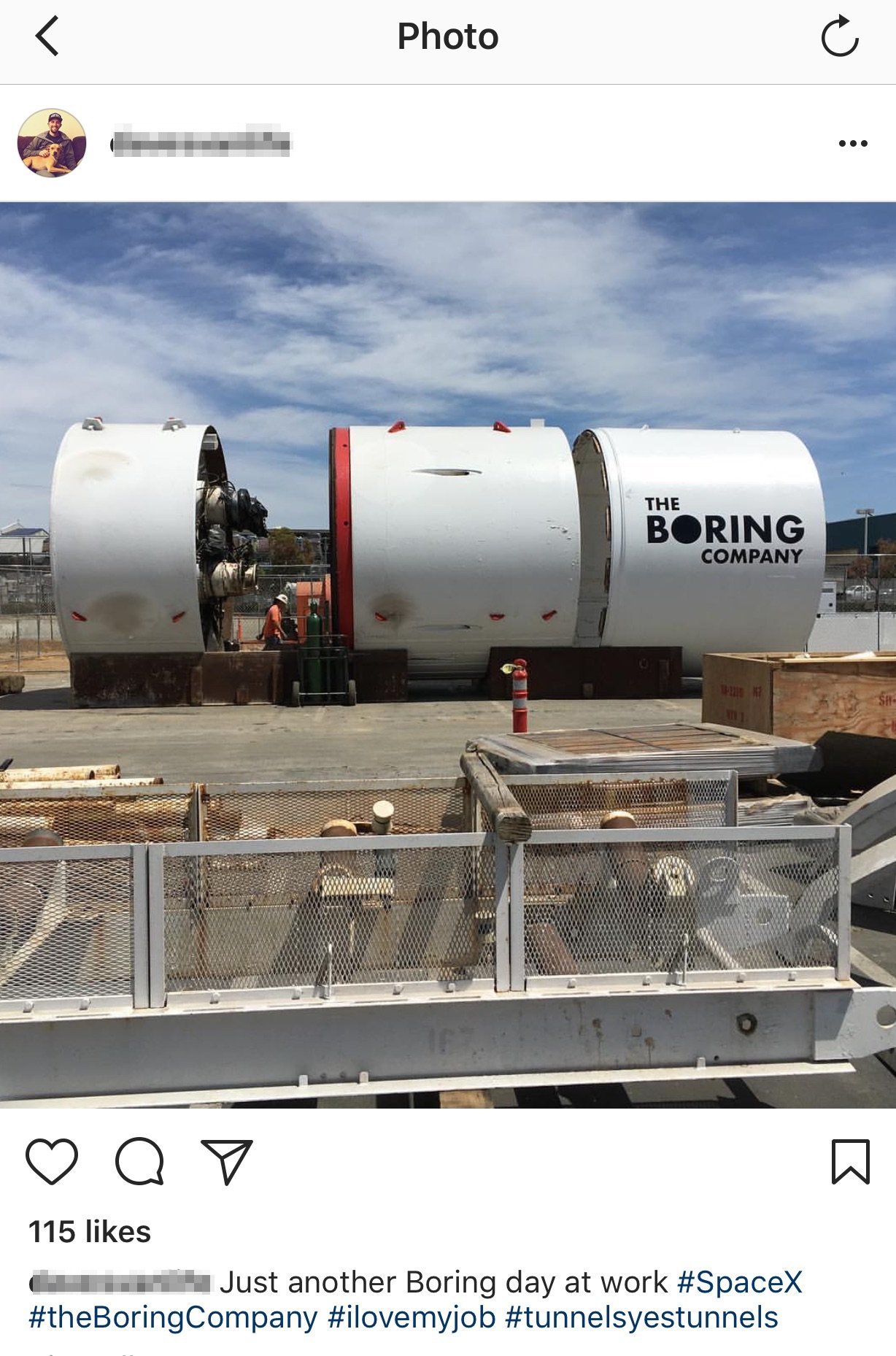 Также сотрудник SpaceX опубликовал в Instagram снимок первого бурильного аппарата компании Илона Маска The Boring Company. Он будет использован для рытья подземных тоннелей в Лос-Анджелесе. После того как снимок опубликовало издание Business Insider, сотрудник SpaceX закрыл свой аккаунт в Instagram.