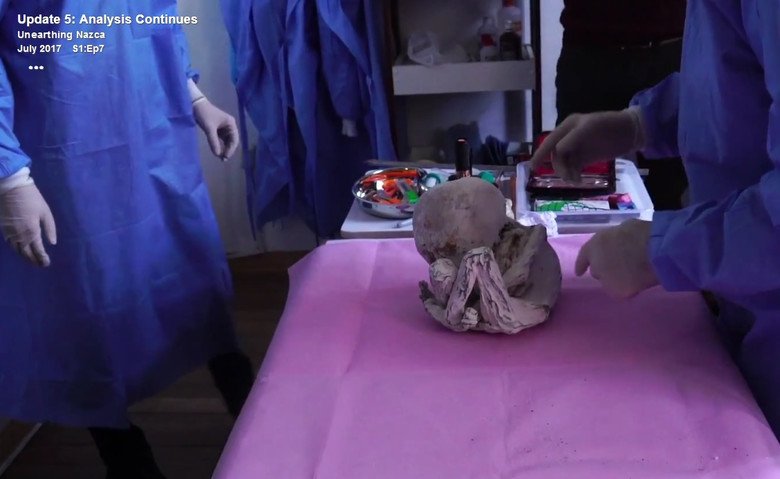 Группа ученых, занимающаяся исследованием предполагаемых останков инопланетян, обнаруженных в секретной гробнице в перуанской пустыне Наска, занялась изучением самой маленькой из пяти мумий, которую уже окрестили в Интернете "младенцем пришельца".