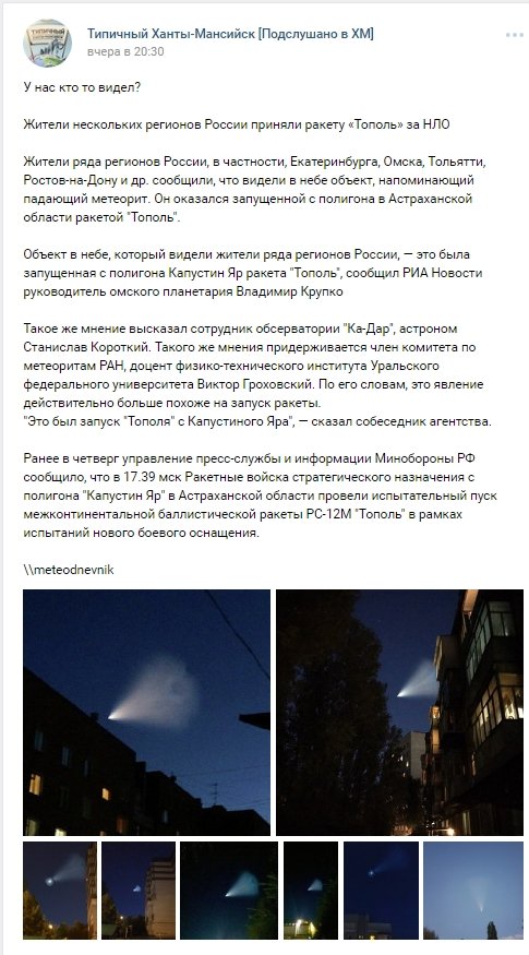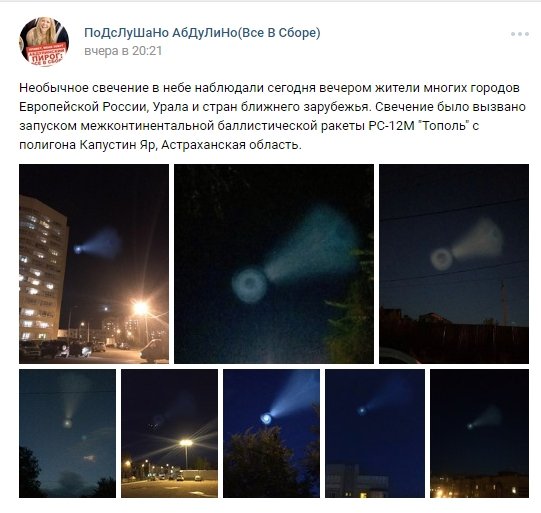 Произведенный накануне российским оборонным ведомством на полигоне Капустин Яр в Астраханской области успешный испытательный запуск МБР "Тополь" переполошил жителей Урала и Приволжского федерального округа: россияне приняли след от запущенной межконтинентальной баллистической ракеты за НЛО.