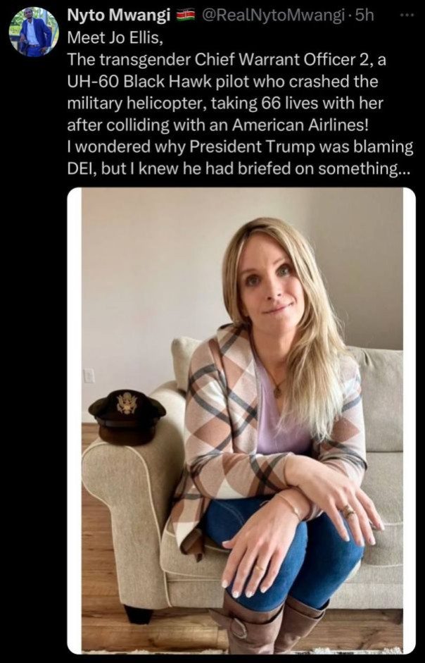 Стало известно, что пилотом вертолета Black Hawk, трансгендер*. В Сети появилась информация, что управлял вертолетом, который протаранил пассажирский самолет в Вашингтоне, был пилот-стажёр Джо Эллис.