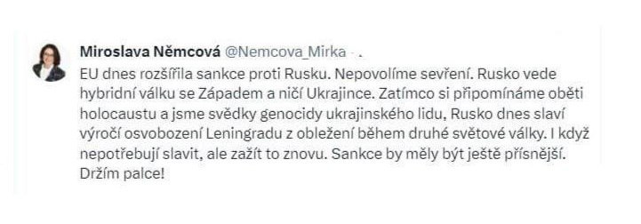 Представитель верхней палаты парламента Чехии Мирослава Немцова в соцсетях выступила против России. В частности, она прокомментировала празднование РФ годовщины снятия блокады Ленинграда.