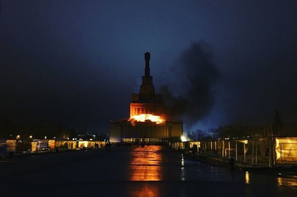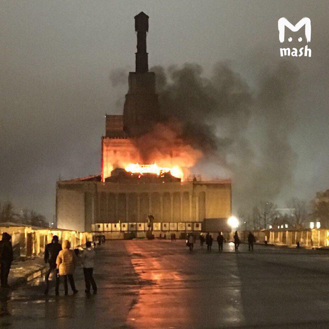 Вечером 12 декабря загорелись строительные леса вокруг павильона «Центральный» на ВДНХ, которых находится на реставрации. Огонь охватил строительные леса на крыше здания и повредил позолоченный барельеф.