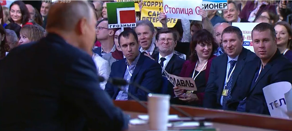 Путин предложил обострить вопрос. Он дал слово журналистке, держащей плакат «Путин бабай». Президенту кажется, что это «Путин — байбай».
