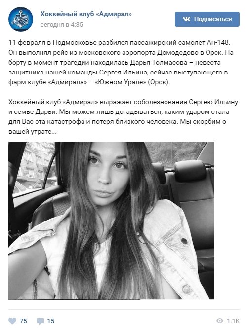 "В нашей семье случилось страшное горе… Сегодня в результате авиакатастрофы на борту самолета, следовавшего из Москвы в Орск, погибла подруга нашего защитника "Адмирала" Сергея Ильина Дарья Толмасова… Ей было всего 22 года… Мы выражаем самые глубокие соболезнования нашему другу и его семье… Сережа, держись и крепись…" — рассказал спортивный агент Шуми Бабаев.
