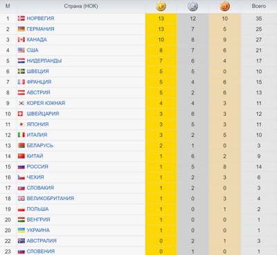 Медальный зачет Олимпиады 2018 в Пхёнчхане на 23 февраля 2018. Таблица