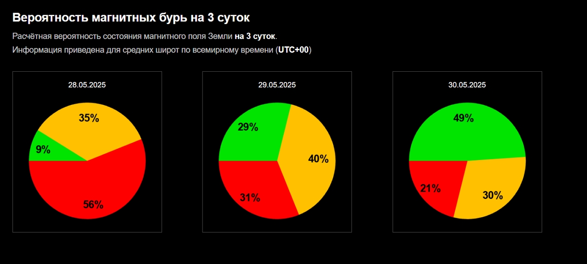 Вероятность магнитной бури 29 мая составляет 31%, шанс слабых колебаний магнитосферы — 40%, а вероятность, что на земле магнитосфера останется в спокойном состоянии составляет 29%.