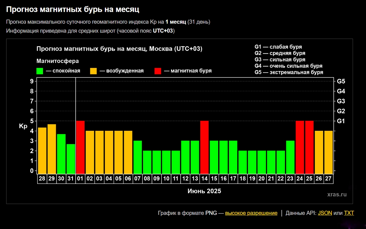 Также ожидаются малые магнитные бури практически на протяжении всего июня: 2 июня, с вечера 3 по 7 июня, с вечера 9 по 10 июня, с вечера 14 по 17 июня, с вечера 23 по 28 июня.