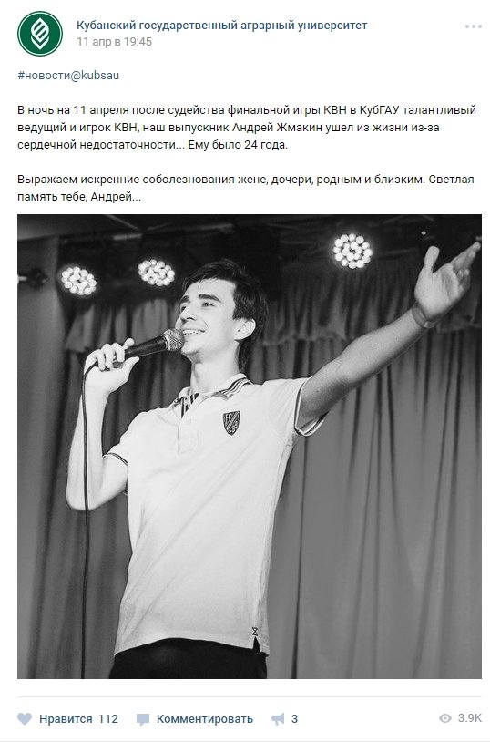 В Краснодаре в ночь на 11 апреля в возрасте 24 лет умер участник популярного телевизионного шоу "Comedy Баттл" Андрей Жмакин. Молодому человеку стало плохо на улице. По некоторым данным, он скончался от сердечной недостаточности, хотя никогда не жаловался на плохое самочувствие. Незадолго до ухода из жизни он разговаривал по телефону.