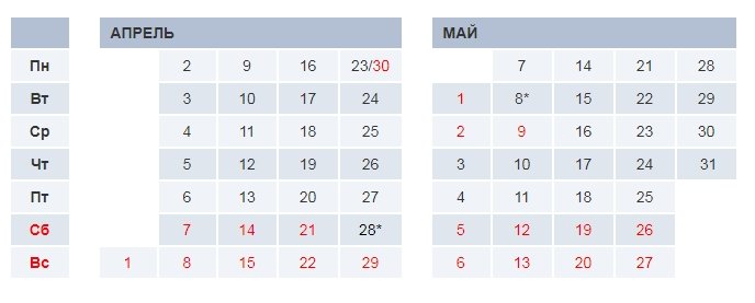 После первой волны майских праздников следует выходить на работу в четверг, 3 мая, а также отработать пятницу, 4 мая, после чего снова наступят выходные.