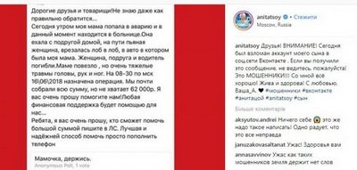 «Дорогие друзья и товарищи! Даже не знаю, как правильно обратиться. Сегодня утром моя мама попала в аварию и сейчас находится в больнице. Она ехала с подругой домой, но на пути им встретилась пьяная женщина. В итоге, столкновение лоб в лоб. Подруга, водитель и пьяная женщина погибли. Маме повезло, но она получила очень серьезные травмы головы, рук и ног. Мы собрали практически всю сумму, необходимую для операции, но не хватает еще 62 000 рублей», — такое сообщение рассылалось от лица сына Аниты Сергея.