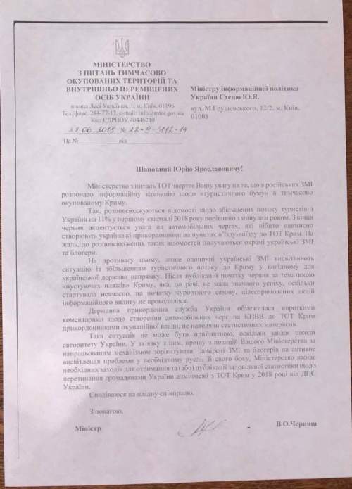После серии публикаций об увеличении количества украинских туристов в Крыму правительство Украины решило «исправить» ситуацию и начало готовить новую информационную атаку. Как написал на своей странице в Facebook бывший народный депутат Алексей Журавко, глава министерства по делам временно оккупированных территорий Вадим Черныш написал письмо на имя главы Мининформации Юрия Стеця о провальной операции по освещению туристического сезона в Крыму и просит разработать план по минимизации турпотока на российский полуостров.
