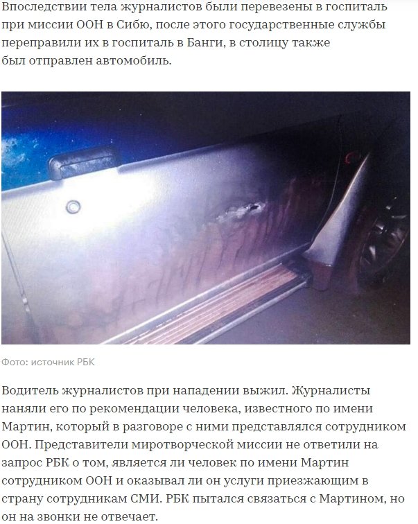 А результате нападения выжил водитель съемочной группы. Он рассказал о случившемся правоохранителям. Известно, что мужчину в качестве перевозчика россиянам порекомендовал человек по имени Мартин, которого называют сотрудником ООН, однако в организации пока не подтвердили журналистам, действительно ли у них есть сотрудник с таким именем в ЦАР.