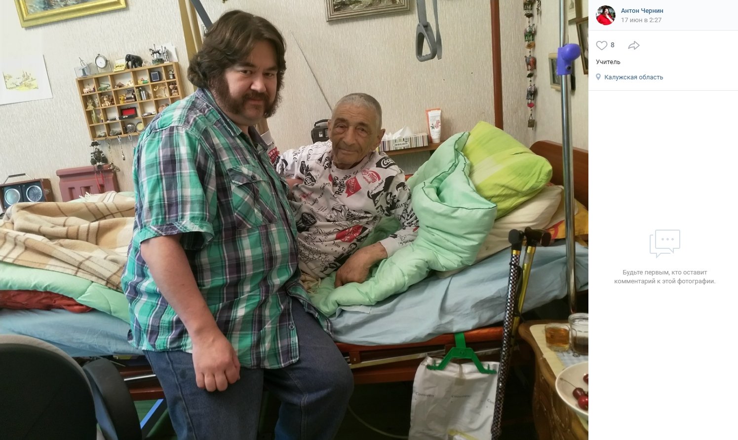 На совместном снимке сильно похудевший Эдуард Успенский полулежит на медицинской кровати и смотрит в кадр. Рядом стоят костыли и подставка для капельницы.