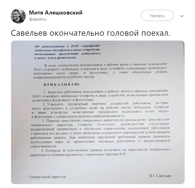 Пост он удалил. В нем говорилось о том, что "Аэрофлот" запретил своим сотрудниках в рабочее время в офисах использовать мобильные телефоны и прочие устройства, позволяющие записывать аудио-файлы.