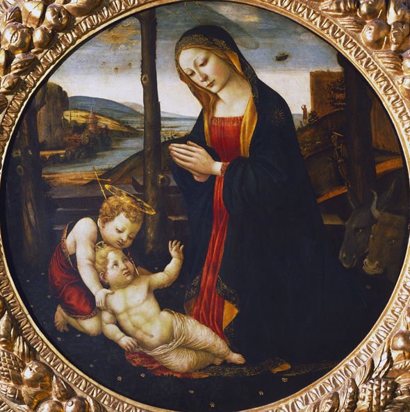 На полотне эпохи Возрождения неизвестного автора, проживавшего во Флоренции, изображена склонившаяся над Иисусом Мадонна. За ее спиной находятся окна, в которые видно небо. На небосводе можно отчетливо увидеть объекты, похожие на НЛО. Так, одно из пятен в правой части картины имеет форму "летающей тарелки", а другие пятна похожи на существа с щупальцами.
