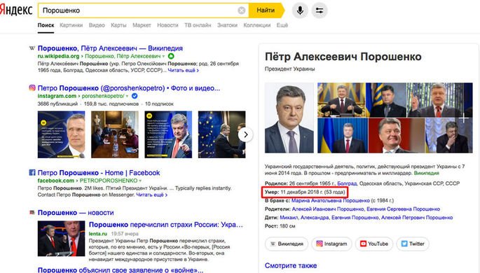 Поисковый сервис «Яндекс» при запросе «Петр Порошенко» внезапно для всех показал краткую справку о президенте Украины, в которой указана дата его смерти. В ней сообщается, что Порошенко умер 11 декабря 2018 года.