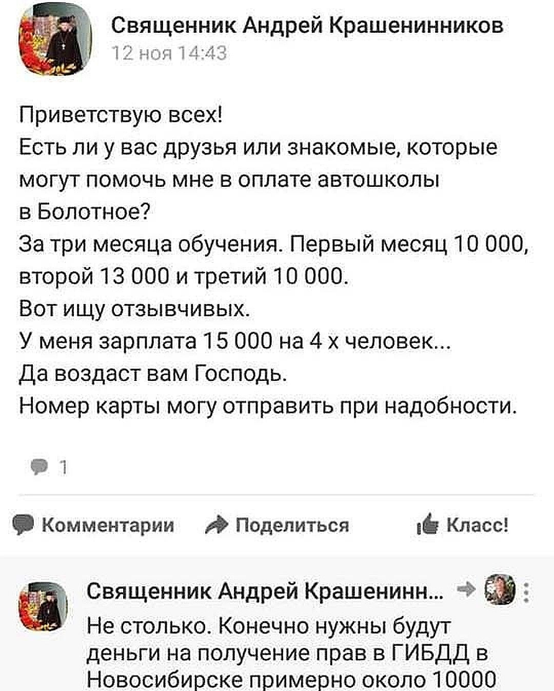 Затем иерей просил жертвователей оплатить ему автошколу. Невозможность оплатить обучение самому он объяснял невысокой зарплатой — 15 тысяч рублей, на которые он содержит жену и двоих детей. Недавно священнику стали угрожать недоброжелатели. По словам Крашенинникова, он получает множество негативных комментариев с угрозами.