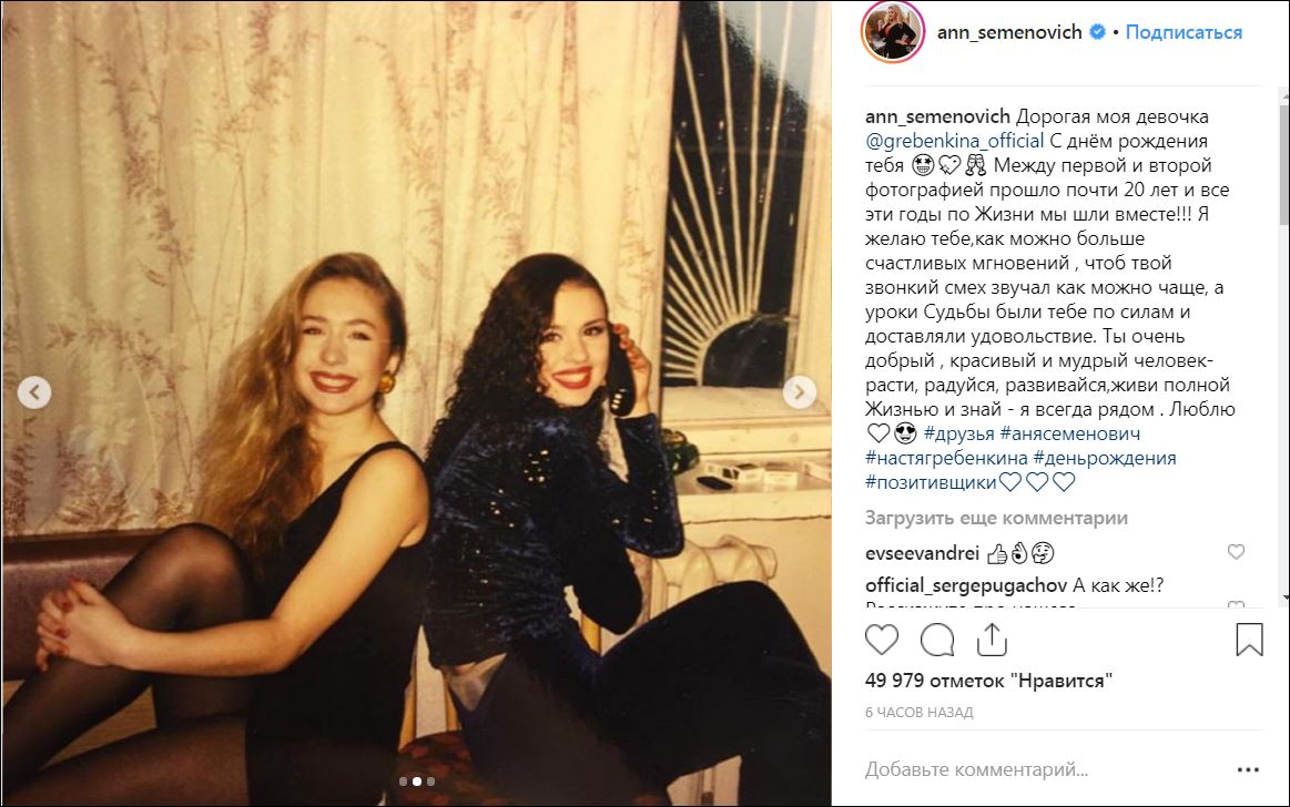 На другой же фотографии 20-летней давности подписчики заметили, что за прошедшие годы ее форм значительно изменились, так как на снимке наблюдатели не обнаружили внушительных размеров груди Семенович. Отметим, что публикация посвящена поздравлению подруги Семенович Анастасии Гребенкиной с Днем Рождения.