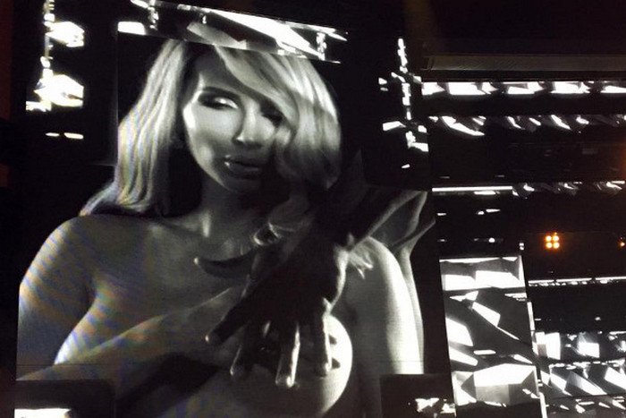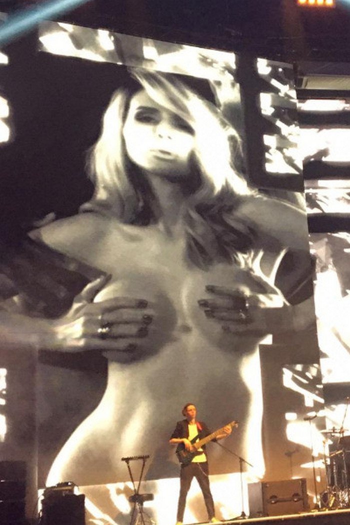 Как можно увидеть на снимках, во время выступления певицы на огромном экране ее эротические снимки. На них она изображена топлес, грудь прикрывает руками. Причем, периодически на груди оказывается и мужская рука.