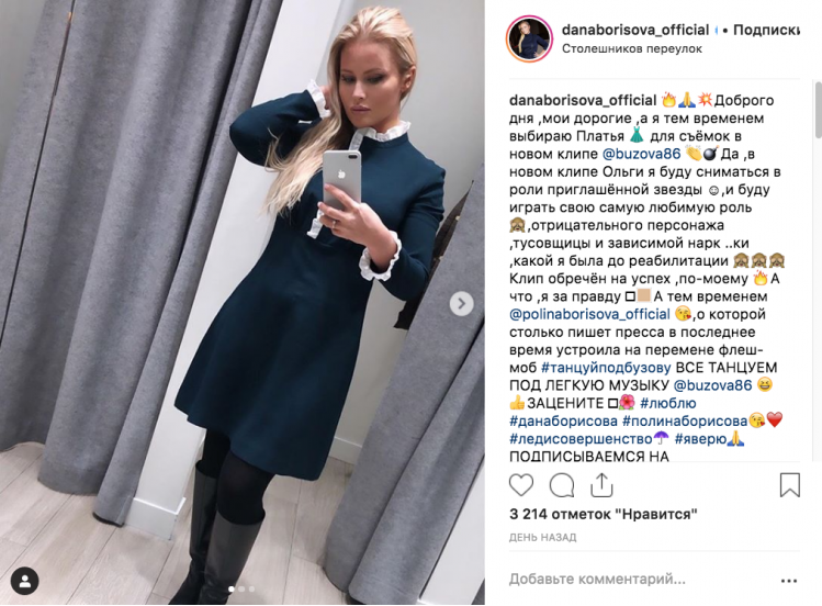 "Доброго дня ,мои дорогие ,а я тем временем выбираю платья для съёмок в новом клипе Бузовой. Да ,в новом клипе Ольги я буду сниматься в роли приглашённой звезды и буду играть свою самую любимую роль, отрицательного персонажа ,тусовщицы и зависимой нарк ..ки ,какой я была до реабилитации", — написала она.