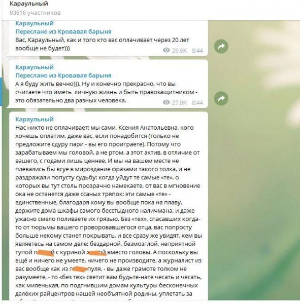 Сама Ксения Собчак в своем Telegram-канале устроила перепалку с авторами другого блога. После ее критики в адрес россиян, заинтересовавшихся семейной драмой, появилось множество ироничных отзывов по поводу случившегося. Комментарий канала "Караульный", похоже, сильнее всего задел телеведущую, и она решила высказать все, что думает о нем.