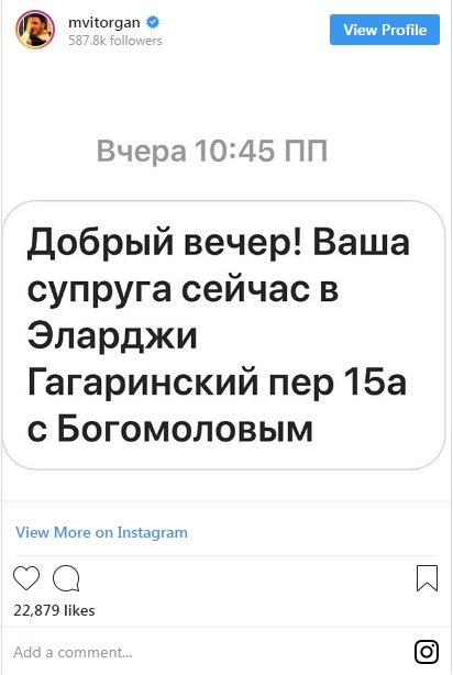 На странице в своем Instagram, отвечая на SMS неизвестного абонента о том, что его жену снова видели в компании Богомолова, Виторган фактически заявил о расставании с супругой.