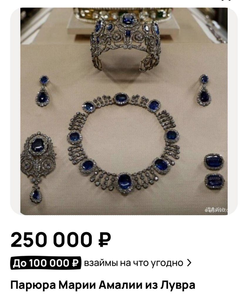 Между тем, неизвестные шутники разместили в Сети объявление о продаже коллекции исторических украшений, украденных из Лувров. Судя по описанию, продает их житель Москвы – всего за 250 тыс. рублей. Ранее их продавали за 250 млн рублей.