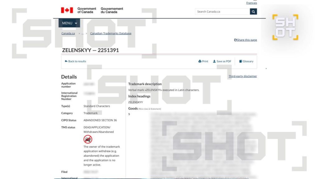 Российские СМИ сообщили о попытке регистрации товарного знака в Канаде. Человек, чьи данные совпадают с данными украинского президента Владимира Зеленского, попытался зарегистрировать марку Zelenskyy.