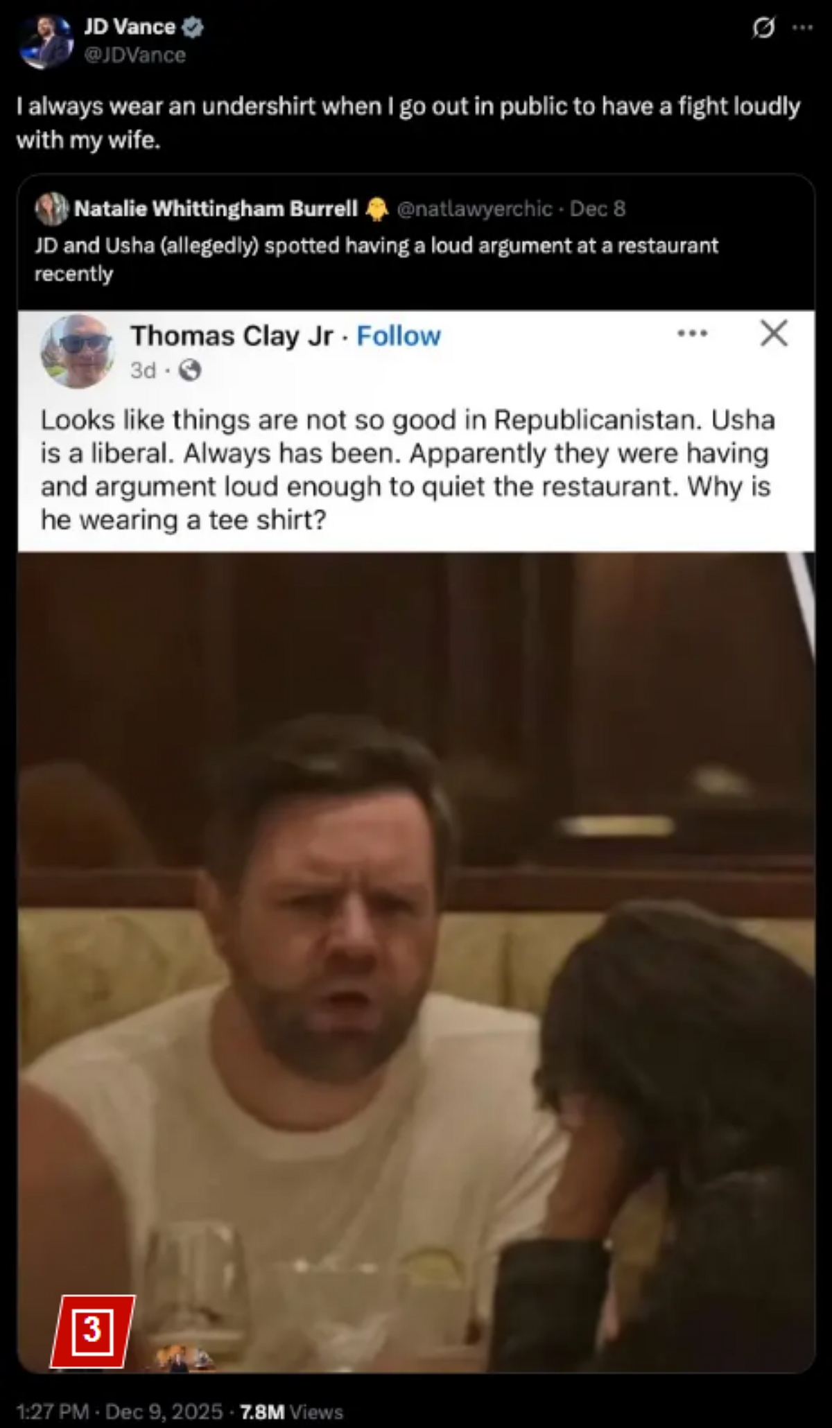 На днях в Сети появились фото, на которых вице-президент США Джей Ди Вэнс, находясь в ресторане, якобы кричит на свою супругу Ушу.