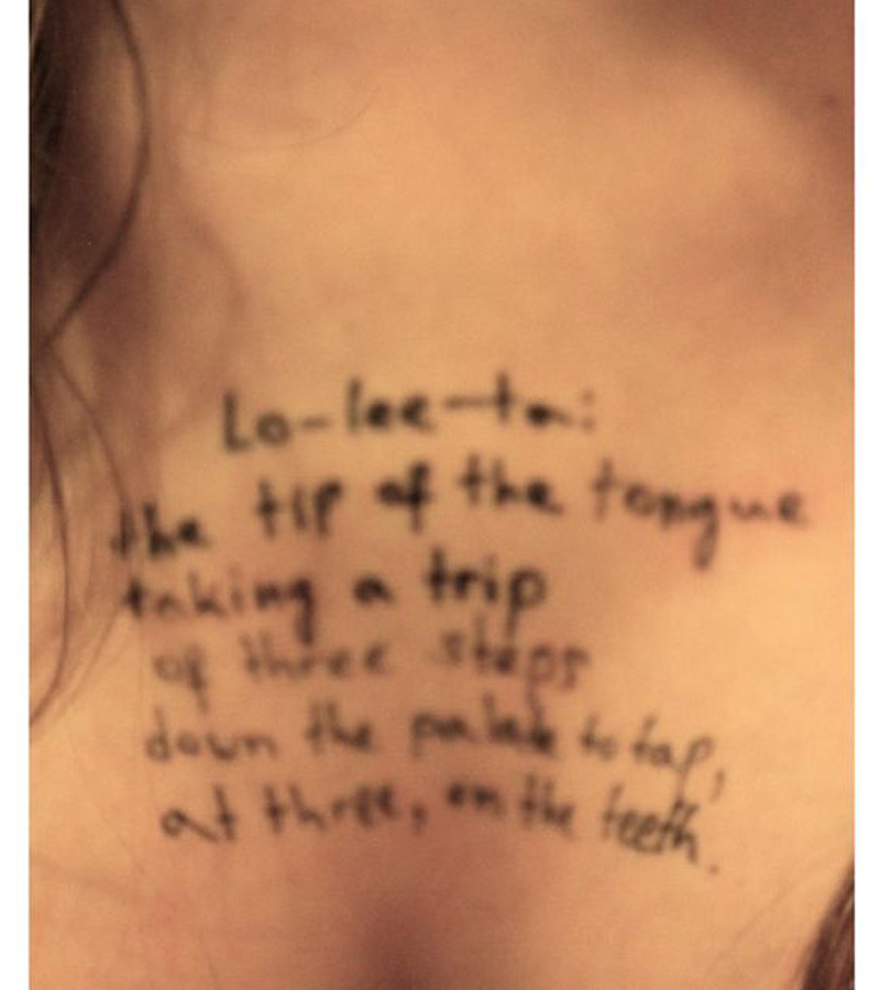 Есть также фотографии с цитатами из «Лолиты», размещенные на женском бедре и вдоль позвоночника,