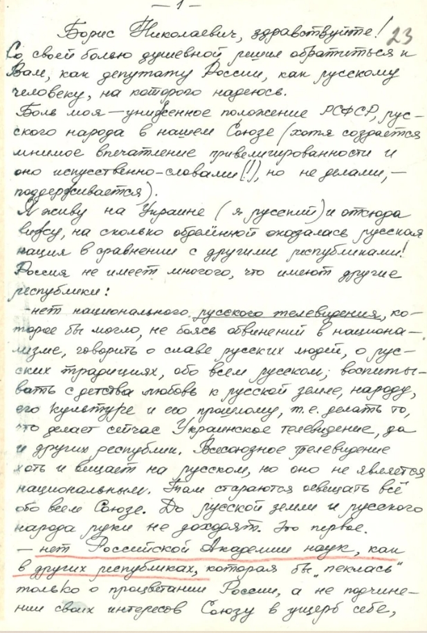 «Борис Николаевич, здравствуйте! Со своей болью душевной решил обратиться к вам, как к депутату России, как к русскому человеку, на которого надеюсь», — обращается украинец к Ельцину.