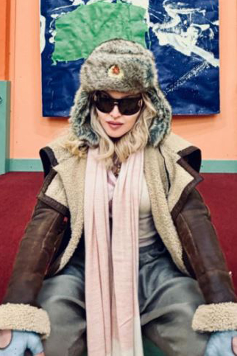 Мадонна выбрала для посещения экспозиции шапку-ушанку, украшенную серпом и молотом, стилизацию под советский головной убор.