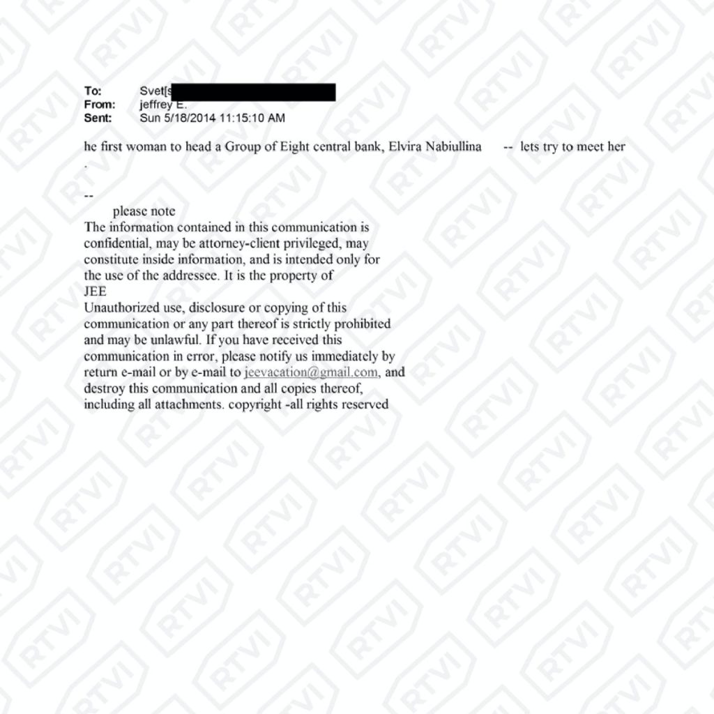 О Набиуллиной говорится в одном из сообщений за май 2014 года Эпштейна, отправленном на скрытый адрес электронной почты.