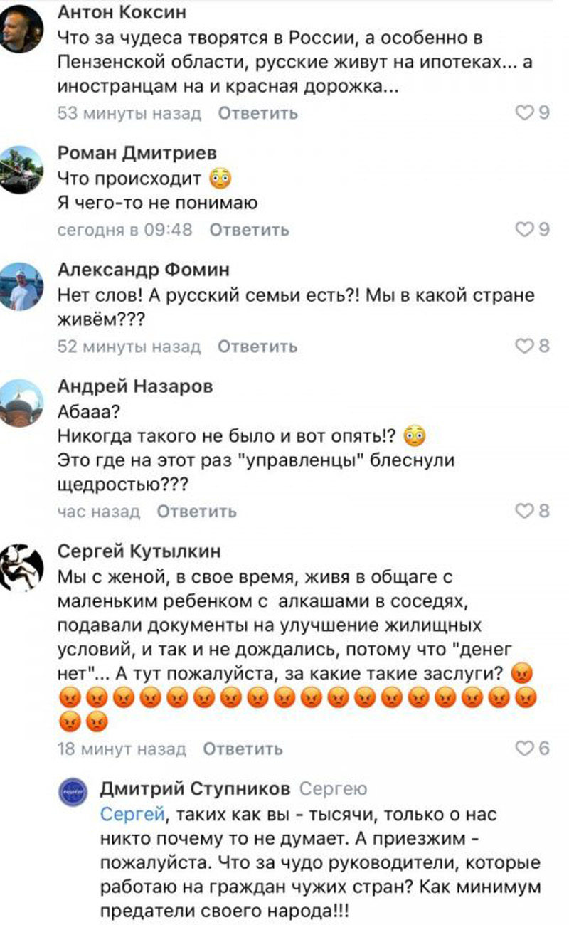 «Почему русские должны тянуть ипотеку и ютиться в общежитиях с детьми, пока «новые россияне» спокойно получают ключи от квартир по федеральному проекту», — задаются вопросом жители.