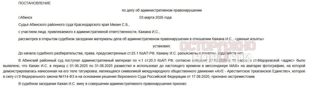 Наказали за MAX жителя кубанской станицы Фёдоровской Ивана Кажана. Судя по постановлению, летом 2025 года Кажан поставил на аватарку в MAX восьмиконечную звезду — символ запрещённого движения АУЕ.