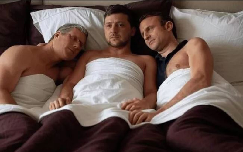 Это сгенерированная ИИ фото, на котором президент Украины Владимир Зеленский, премьер-министр Великобритании Кир Стармер и президент Франции Эммануэль Макрон лежат обнаженными в одной постели*.