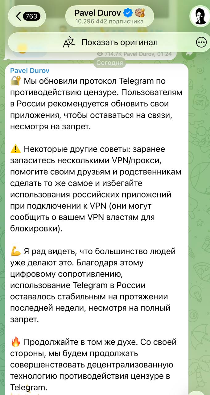«Некоторые другие советы: заранее запаситесь несколькими VPN/прокси, помогите своим друзьям и родственникам сделать то же самое и избегайте использования российских приложений при подключении к VPN (они могут сообщить о вашем VPN властям для блокировки)», — написал Дуров в своих соцсетях.