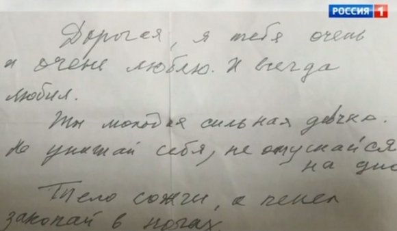 В прощальном письме содержатся следующие строки: "Не унижай себя, не опускайся на дно. Тело сожги, а пепел закопай в ногах".