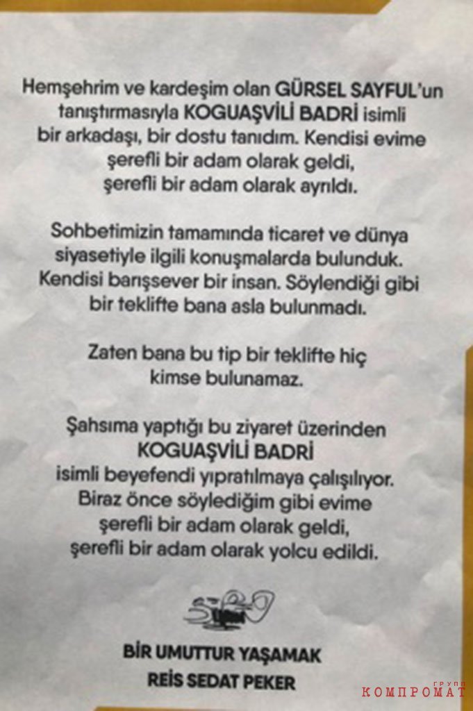 Появившийся документ подтверждает хорошие отношения между Пекером и врагом вора в законе Гули Бадри Когуашвили (Бадри Кутаисский) и опровергает слухи о том, что якобы последний склонял турецкого "авторитета" убить Гули.