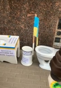 На появившихся в Сети кадрах видно, что к унитазам прикреплены листы с надписями: "Поддержим боевую мощь Украины", "ВМФ Украины" и названия кораблей. Также там нарисованы украинские флаги. К тому же среди принесенного к посольству оказались горшок и ведро, к которому крепился флаг Украины.