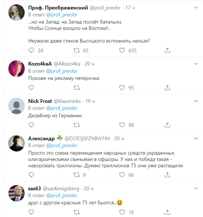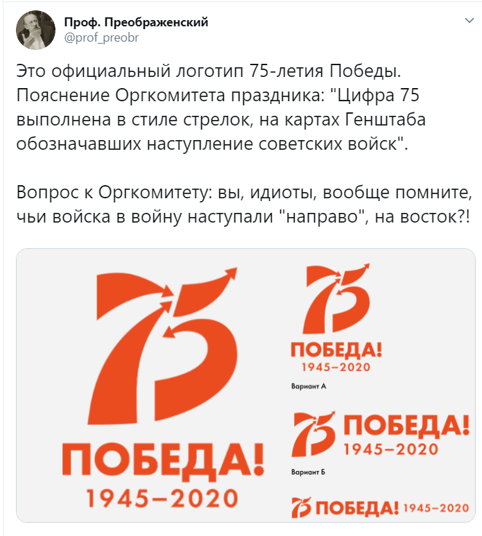«И, видя вот эту гадость, — я отлично отдаю себе отчёт в том, что я называю официальный логотип 75-летия Победы гадостью — я считаю, что идиотами и/или вредителями были все, по списку: от заказчиков и исполнителей до тех, кто вот это утвердил», — заключил Примаков.