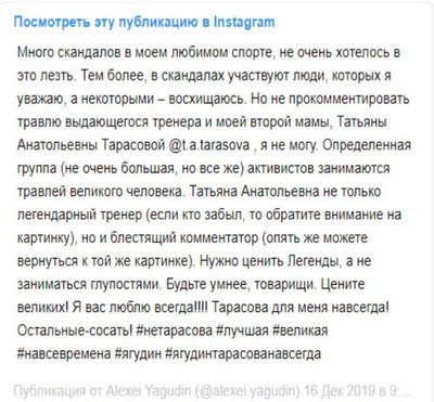 Известный российский фигурист, олимпийский чемпион Алексей Ягудин высказался в поддержку тренера Татьяны Тарасовой в своем Instagram.